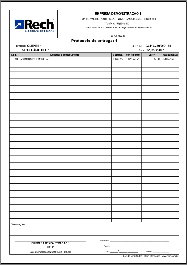 R-Meia Página Gráfico: Impressão gráfica do protocolo de documento, utiliza meia folha com 10 itens ou 5 itens com seus complementos.