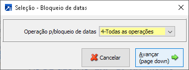 4-Todas as operações: Bloqueia todas as operações para fazer a manutenção de datas bloqueadas do financeiro. Ao avançar será exibida a janela "Selecione as datas bloqueadas", selecione a data a ser bloqueada e o SIGER® exibe "Bloqueada" em todas as colunas, avançar para gravar o bloqueio.