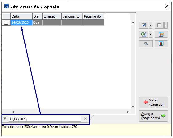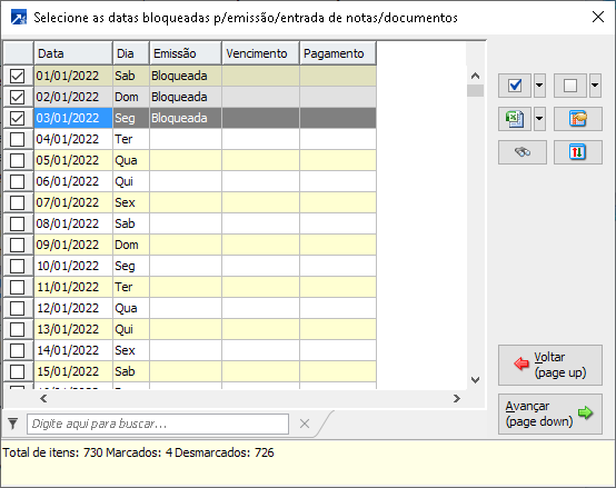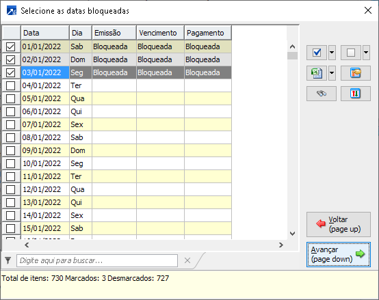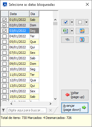 Ao acessar o menu será exibida a janela "Seleção - Bloqueios de datas".