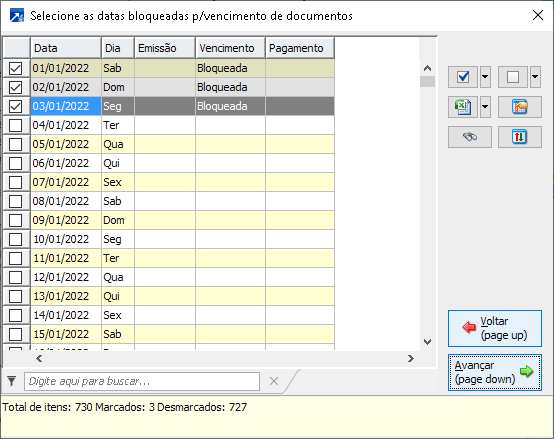 2-Vencimento: Bloqueia somente a operação de vencimento para fazer a manutenção de datas bloqueadas do financeiro. Ao avançar será exibida a janela "Selecione as datas bloqueadas p/vencimento de documentos", selecione a data a ser bloqueada e o SIGER® exibe "Bloqueada" na coluna "Vencimento", avançar para gravar o bloqueio.
