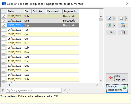 3-Pagamento: Bloqueia somente a operação de pagamento para fazer a manutenção de datas bloqueadas do financeiro. Ao avançar será exibida a janela "Selecione as datas bloqueadas p/pagamento de documentos", selecione a data a ser bloqueada e o SIGER® exibe "Bloqueada" na coluna "Pagamento", avançar para gravar o bloqueio.