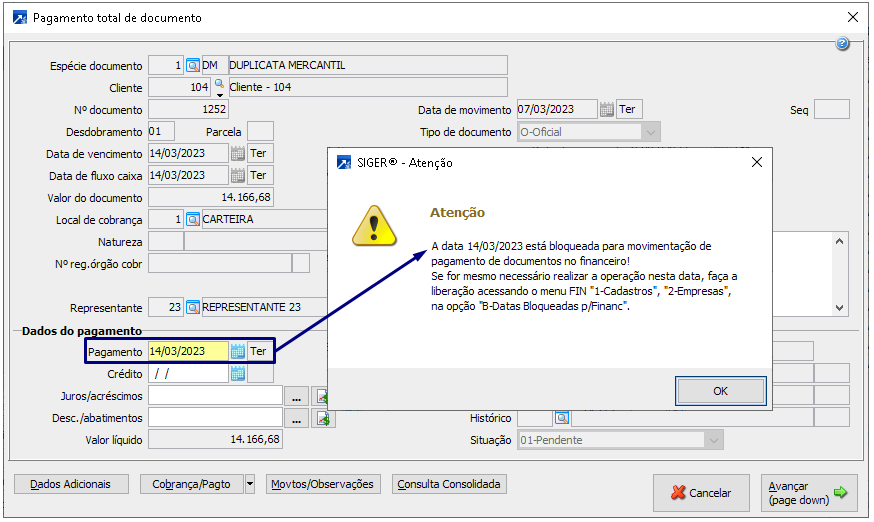 Nessa simulação será realizado o pagamento de um documento com vencimento na data bloqueada para essa operção, logo será exibida mensagem alertando o usuário.