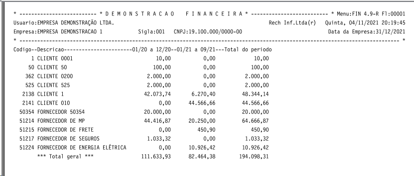 O demonstrativo é emitido no menu FIN 4.9-R (Demonstr.Fin.Div.Períodos).