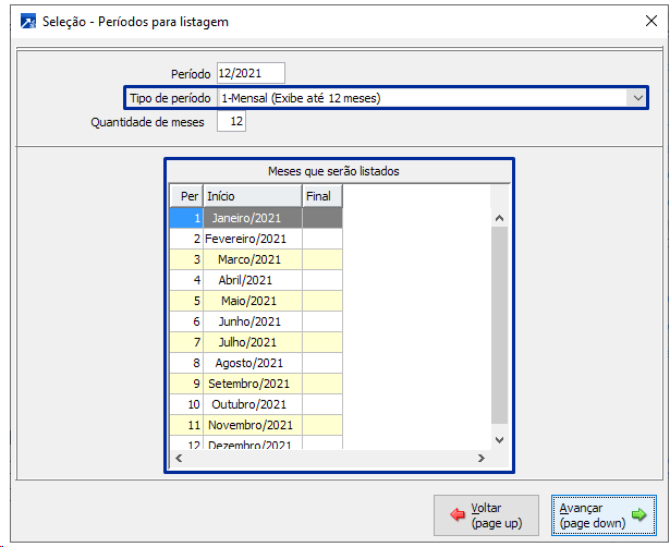 Meses que serão listados: Tipo de período mensal