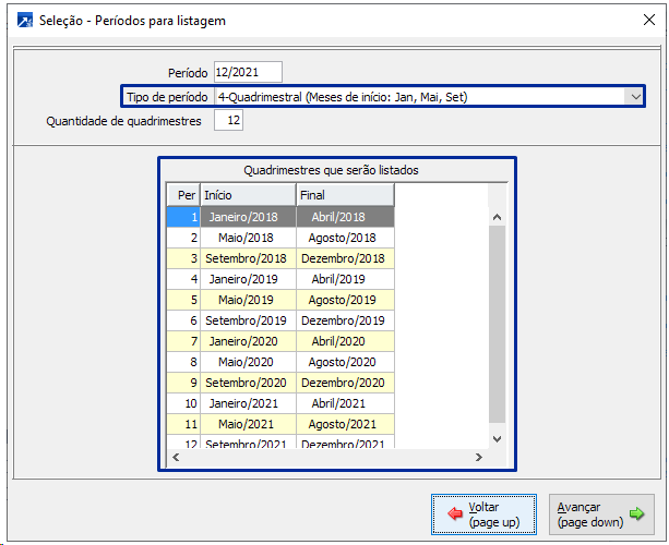 O campo que demonstra os períodos que serão listados, também, é dinâmico, será alterado conforme a seleção do tipo de período e a quantidade de meses, bimestres, trimestres, semestre ou anos informados.