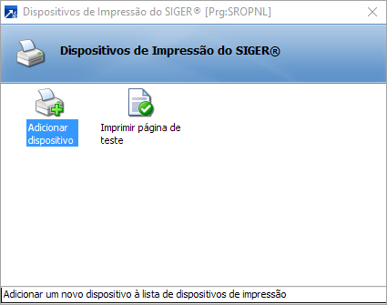 Mesmo que haja impressoras instaladas no computador local (fisicamente ou simplesmente mapeada), estas só se tornaram disponíveis ao SIGER®, se devidamente cadastradas como um dispositivo de impressão. O mesmo também vale para impressoras disponíveis na rede e não necessariamente instaladas no computador local.