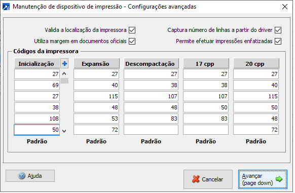 Exibe uma janela com as opções de configurações avançadas do dispositivo de impressão, onde é possível configurar: Validação do endereço da impressora, captura do número de linhas da impressora, utilização de margem em documentos oficiais, capacidade de impressão enfatizada e códigos da impressora.