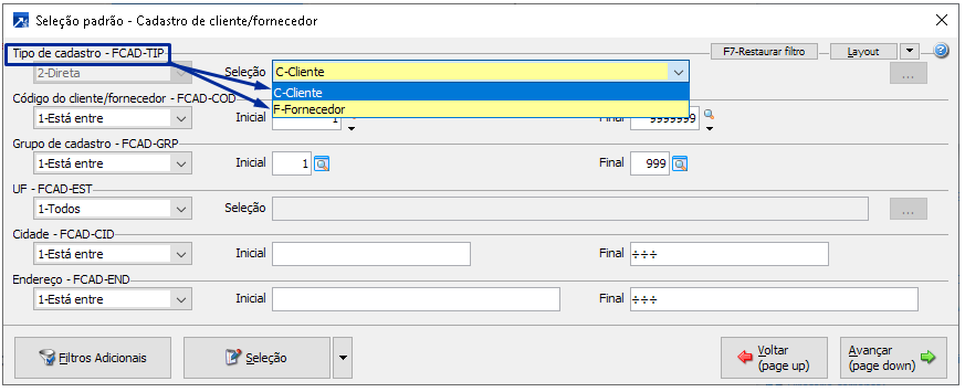 No menu FIN 3.1 (Documentos em aberto) estão disponíveis os relatórios específicos para listagem de documentos em aberto. As listagens de documentos em aberto tem a finalidade de listar os documentos em aberto, ou seja com a situação 01-Pendente, pode ser utilizado para listagem de documentos em aberto de clientes (contas a receber) quanto fornecedores (contas a pagar), basta alterar o tipo de cadastro na "Seleção padrão - Cadastro de cliente/fornecedor", conforme demonstrado no imagem abaixo.