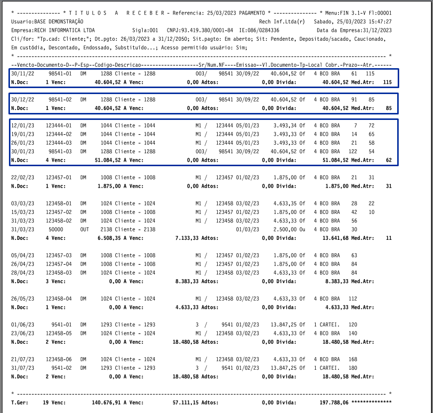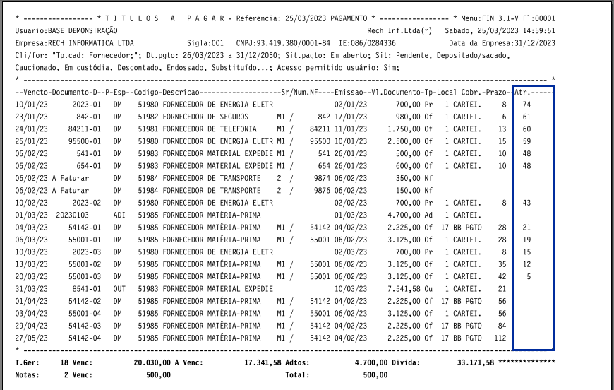 Obs.: Neste relatório é identificado os documentos vencidos na coluna "Atrs", a qual informa a quantidade de dias que o mesmo está vencido, a cada totalizador do cadastro, também, informa o valor total dos documentos vencidos, conforme demonstrado na imagem a seguir.