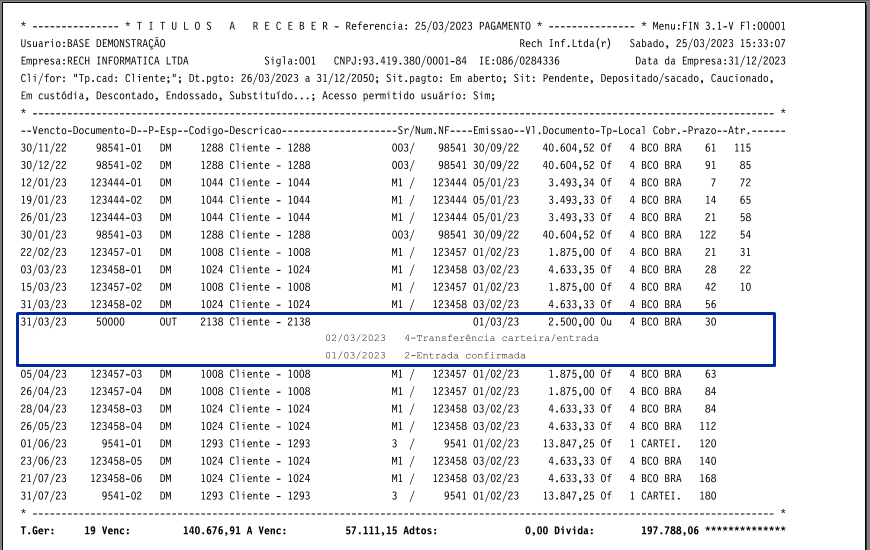 No menu FIN 3.1-V está disponível a listagem de documentos em aberto, este relatório tem a finalidade de listar os documentos em aberto, ou seja com a situação 01-Pendente, pode ser utilizado para listagem de documentos em aberto de clientes (contas a receber) quanto fornecedores (contas a pagar), também, tem a finalidade de listar as notas não faturadas, notas que não possuem documento/desdobramentos, importante para identificar as notas para refaturamento.