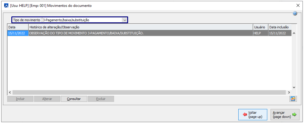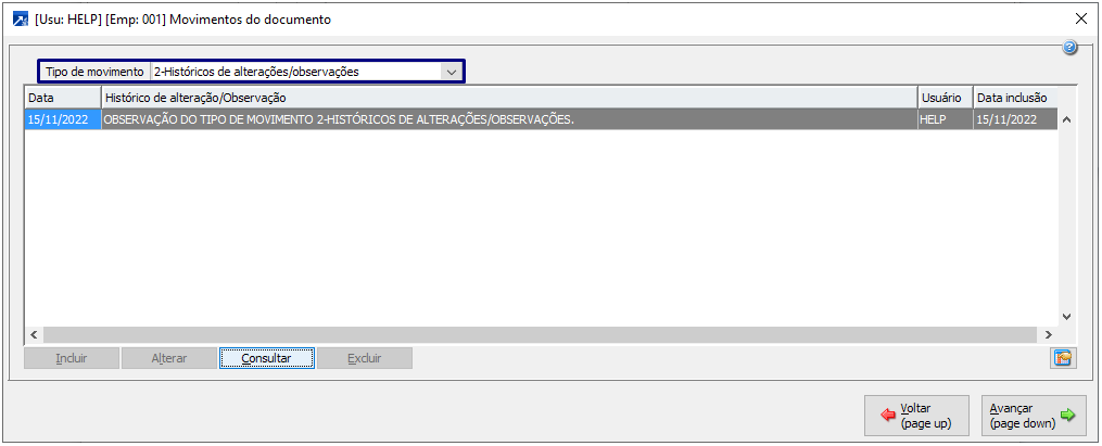 Este campo define a listagem dos históricos de movimentações dos documentos, esses históricos estão gravados nos documentos, no botão <Movtos/Observações>, opções disponíveis.
