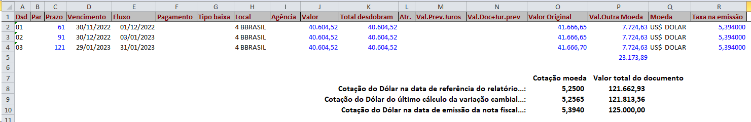 4-Valor outra moeda: Lista o número e série da nota fiscal, conforme exemplo a seguir.
