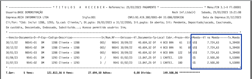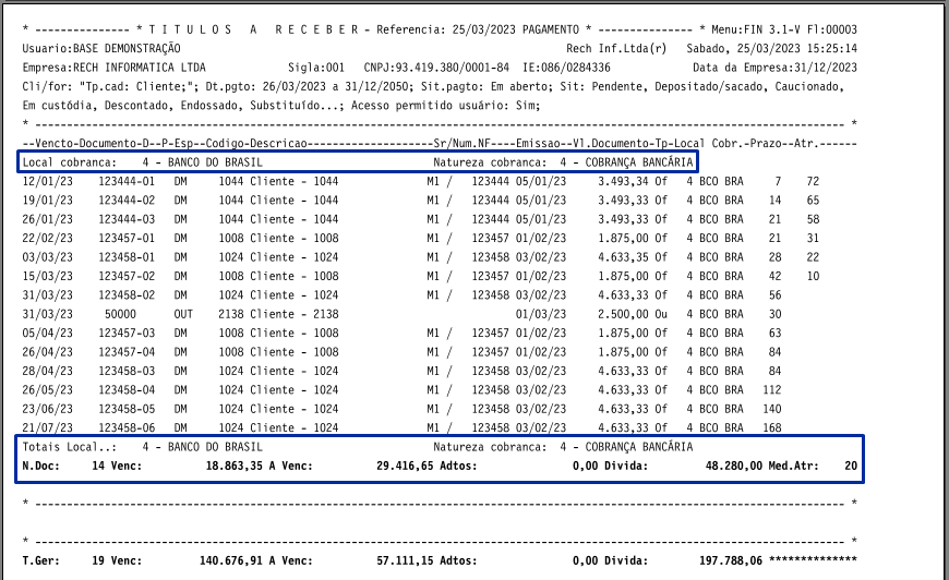 5-Local/Natureza de cobr.: Lista agrupamento pelo local e natureza de cobrança do documento, totalizando os valores dos documentos.