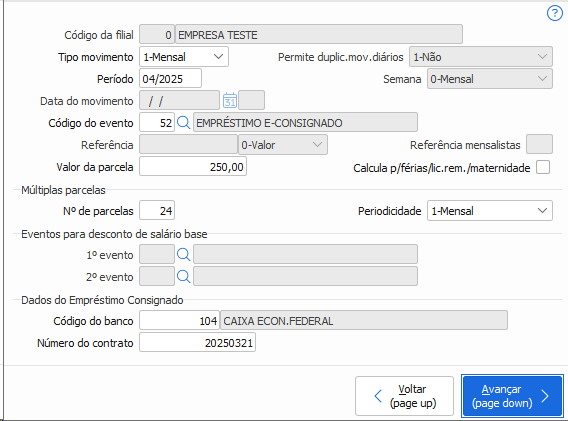 Para fazer o lançamentos das parcelas do empréstimo E-Consignado FPA MENU 2.2-M, informar tipo de movimento, período que inicia o desconto, código do evento criado no FPA MENU 17-M, valor da parcela, quantidade de parcelas, e os dados do banco e numero do contrato do empréstimo.