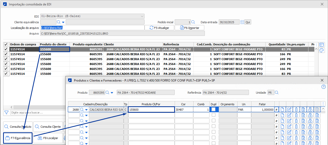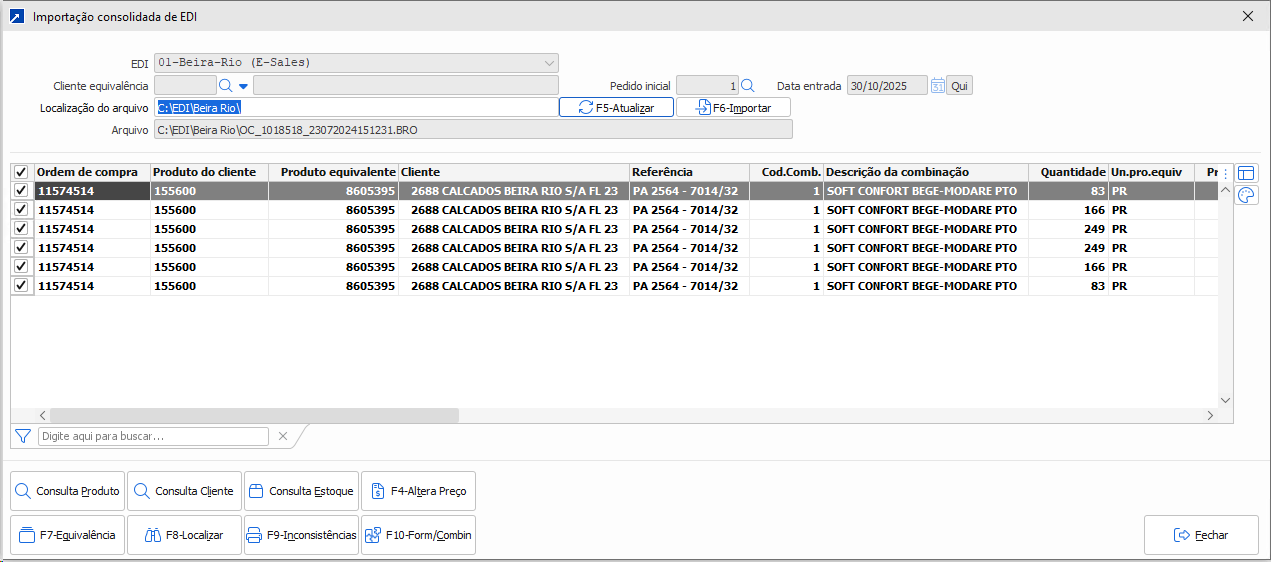 Os pedidos enviados pela empresa Beira Rio devem ser importados por meio do menu FTR 6.6-C – Importação Consolidada de EDI.