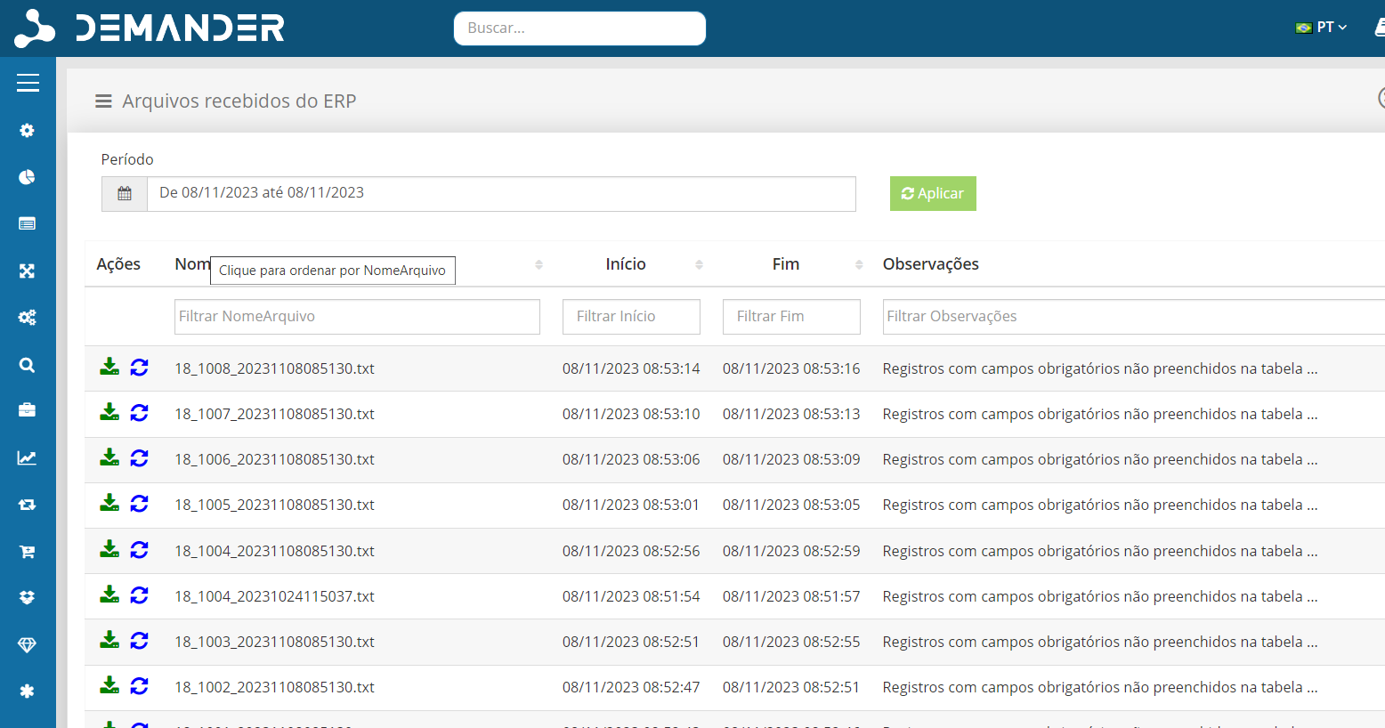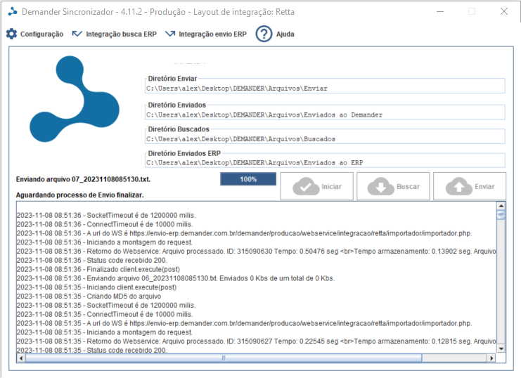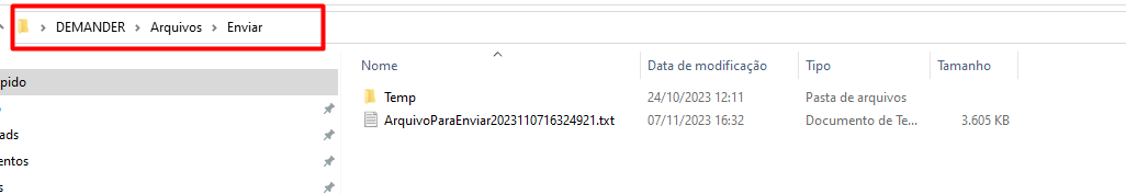 Com o arquivo no diretório DEMANDER > Arquivos > Enviar é possível realizar a importação. É possível configurar outra pasta a escolha do usuário no Sincronizador Demander para salvar os arquivos de importação.