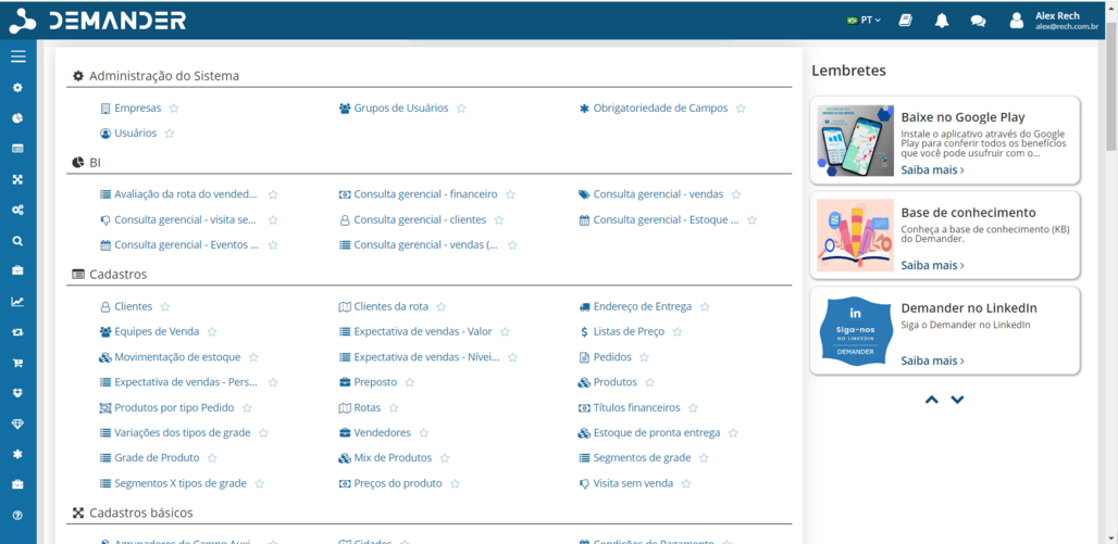 O aplicativo Demander trata-se de uma plataforma de força de vendas utilizada por representantes para cadastrar os pedidos das vendas realizadas, assim como, onde são realizados os cadastros de clientes, locais de entrega, motivos de não venda, entre outras informações pertinentes ao processo comercial. A integração tem como objetivo principal a importação de pedidos, cadastros de lientes e locais de entrega para o Siger® via API Rech e exportação de dados no formato TXT UTF8 gravado em diretório específico. Layout de integração.