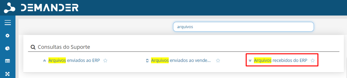 Para verificar os logs de importação do sistema Demander, pesquisar por "arquivos" na barra de pesquisa do site e clicar em "Arquivos recebidos do ERP".