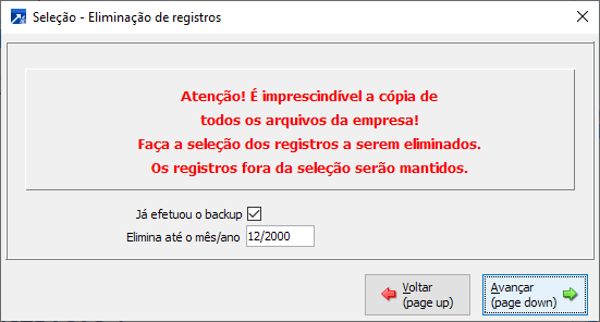 Ao marcar o campo "Sim, desejo prosseguir com a eliminação" e avançar na mensagem será exibida a janela "Seleção - Eliminação de registros", será necessário marcar o campo "Já efetuou o backup" e informar o período para eliminação dos movimentos, contudo essa rotina não possui seleção padrão para filtrar ou selecionar os movimentos a serem eliminados, ou seja, serão eliminados todos os movimentos inclusive o mês/ano selecionado no campo "Elimina até o mês/ano".