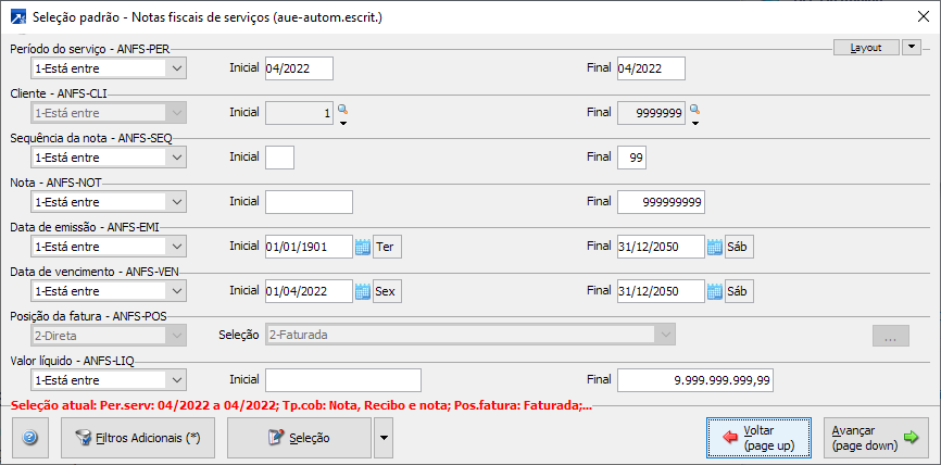 Para emitir as duplicatas, depois de realizar a seleção dos campos na janela "Emissão de duplicatas" será exibida a "Seleção padrão - Notas fiscais de serviços", nessa seleção filtrar as notas para emissão.
