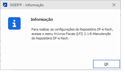 As configurações do Repositório DF-e Rech que anteriormente eram acessadas por essa janela, estão localizadas dentro do menu LFI 2.1-R que trata agora exclusivamente das rotinas de repositório. Neste botão ficou um alerta direcionando o uso para o local correto.