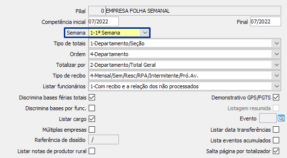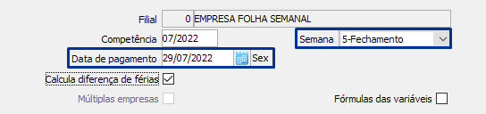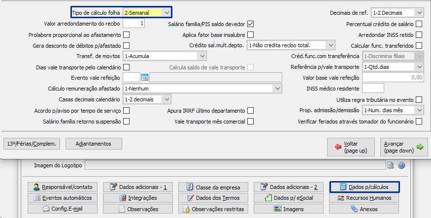 Para configurar a empresa para ter folha semana, será necessário fazer a configuração no cadastro da empresa, no MENU FPA 1.2-A, botão [Dados p/ Cálculo], opção "Tipo de cálculo de folha", opção "2-Semanal".