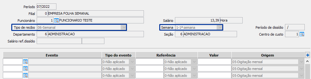 Para calcular cada semana, se faz necessário a inclusão dos movimentos no MENU FPA 2.2-I, selecionando a semana que se referente os movimentos e deverá informar o salário base, horas extras, faltas, atrasos, entre outros adicionais e descontos, que será calculado na semana.