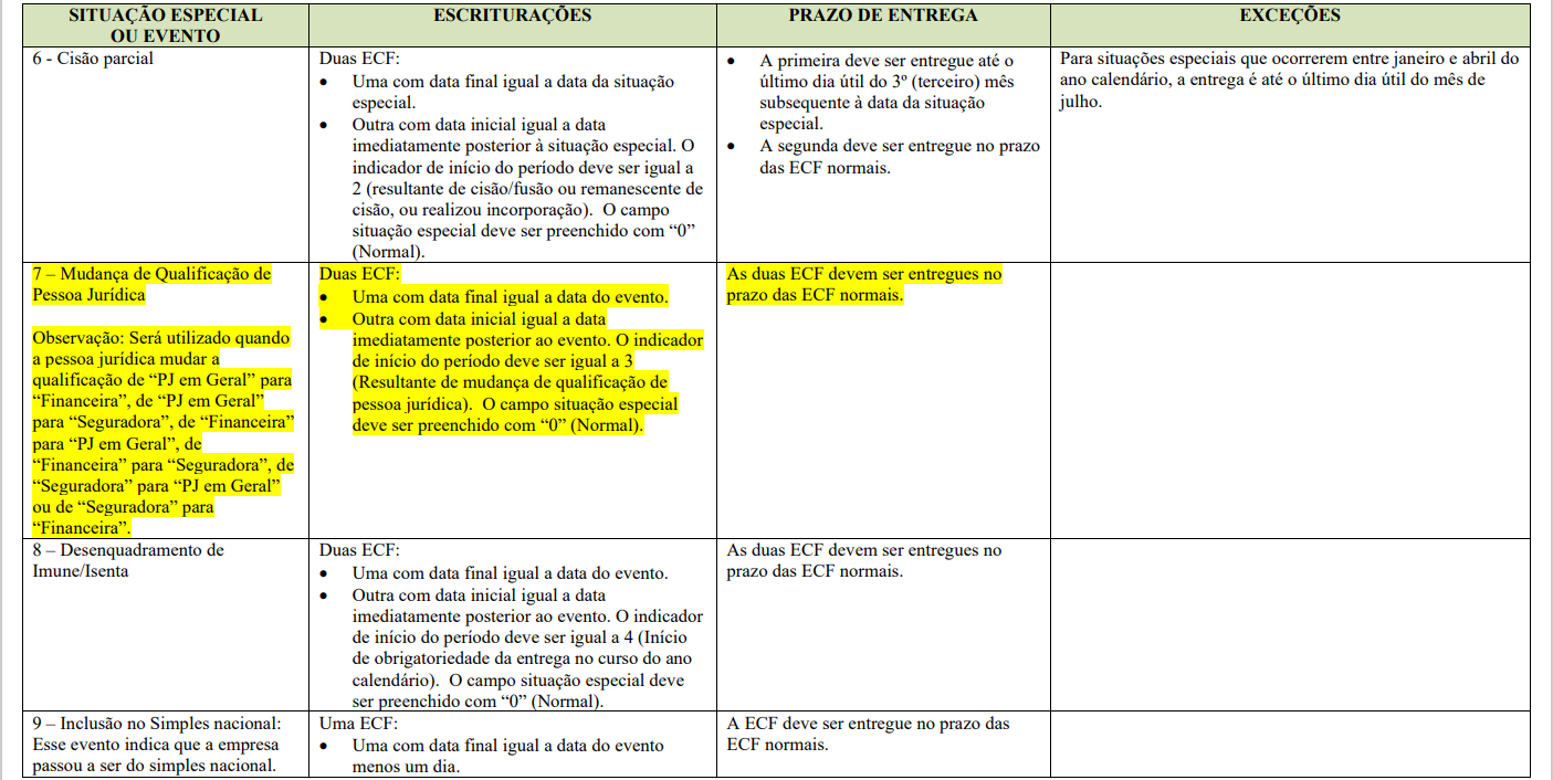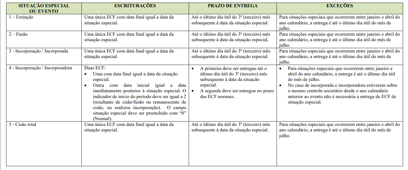 As situações especiais indicadas nos manuais das declarações ECD e ECF, são as seguintes: