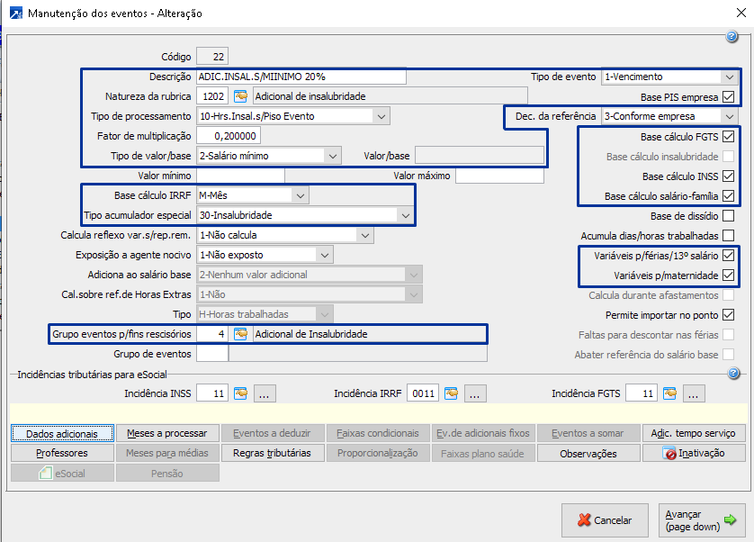 Exemplo: da configuração do evento de Insalubridade grau médio sobre o salário mínimo nacional.