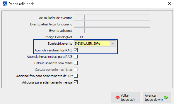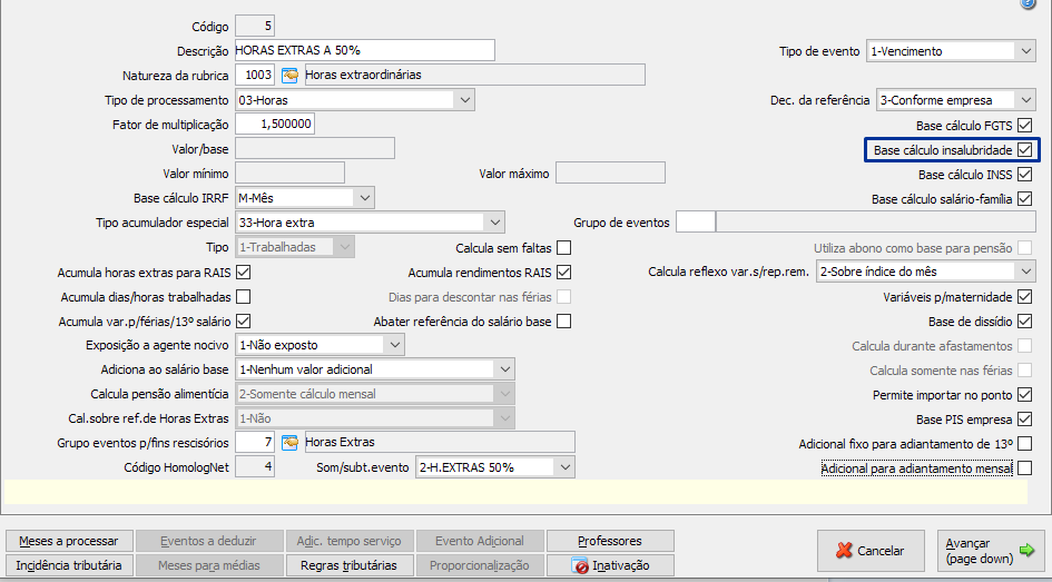 IMPORTANTE: após configurar o evento de Insalubridade para calcular somente sobre as horas extras, é necessário alterar os eventos de Horas extras, menu FPA 1.7-A, desmarcar a check box "Base cálculo Insalubridade", para não ocorrer o pagamento em duplicidade e o tipo de acumulador especial precisa estar com "33-Hora extra".
