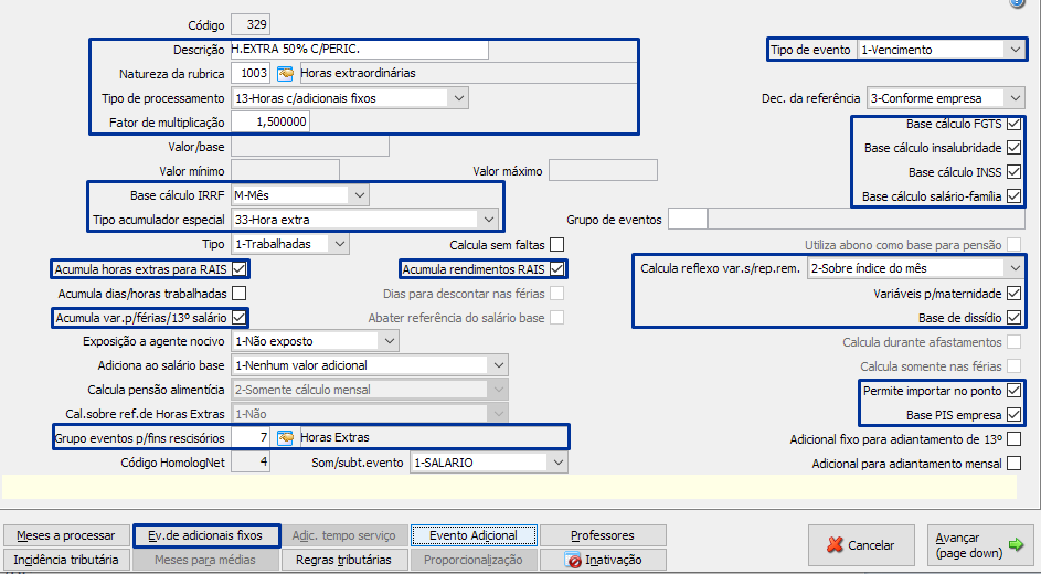 O adicional de Periculosidade deverá ser calculado sobre as horas extras, e no SIGER® poderá configurar a hora extra para calcular sobre a Periculosidade ou cadastrar novo evento de Periculosidade para calcular somente sobre as horas extras.