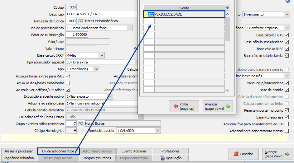 1- Neste EXEMPLO vamos cadastrar o evento de hora extra, menu FPA 1.7-I, para calcular sobre a Periculosidade. Evento de hora extra, precisa ter o tipo de processamento "13-Horas c/adicionais fixos", e no botão [Ev. de adicionaisfixos] informar o evento de Periculosidade.