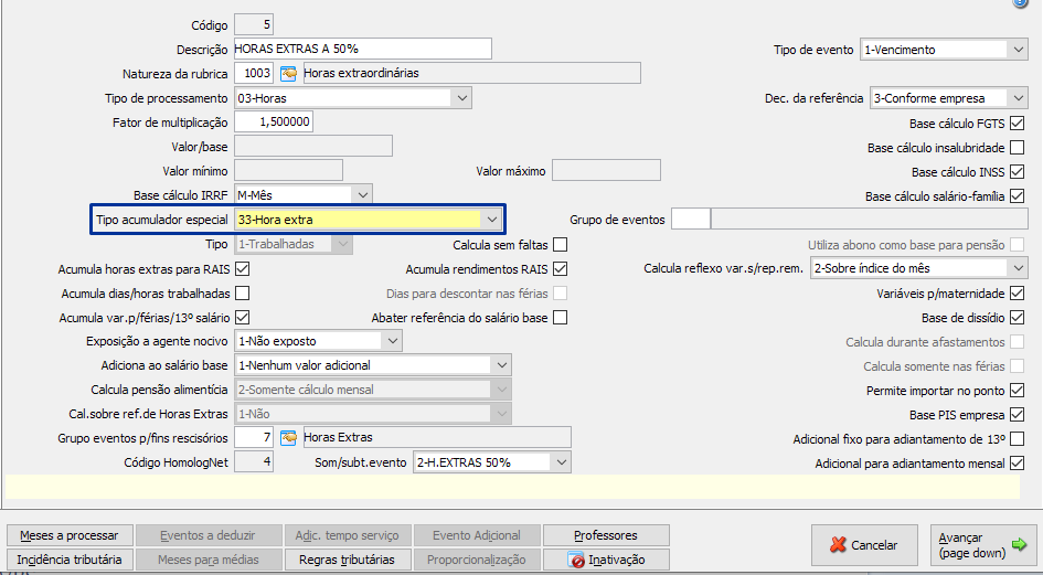 Para o SIGER® identificar as horas extras no momento do cálculo da folha, precisa alterar os eventos de horas extras, menu FPA 1.7-A e informar no campo "Tipo de acumulador especial" opção "33-Hora extra".