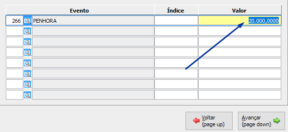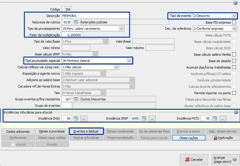Exemplo: vamos cadastrar o evento Penhora sobre o limite de até 20% da remuneração líquida mensal, até o atingir o valor total de R$ 20.000,00.