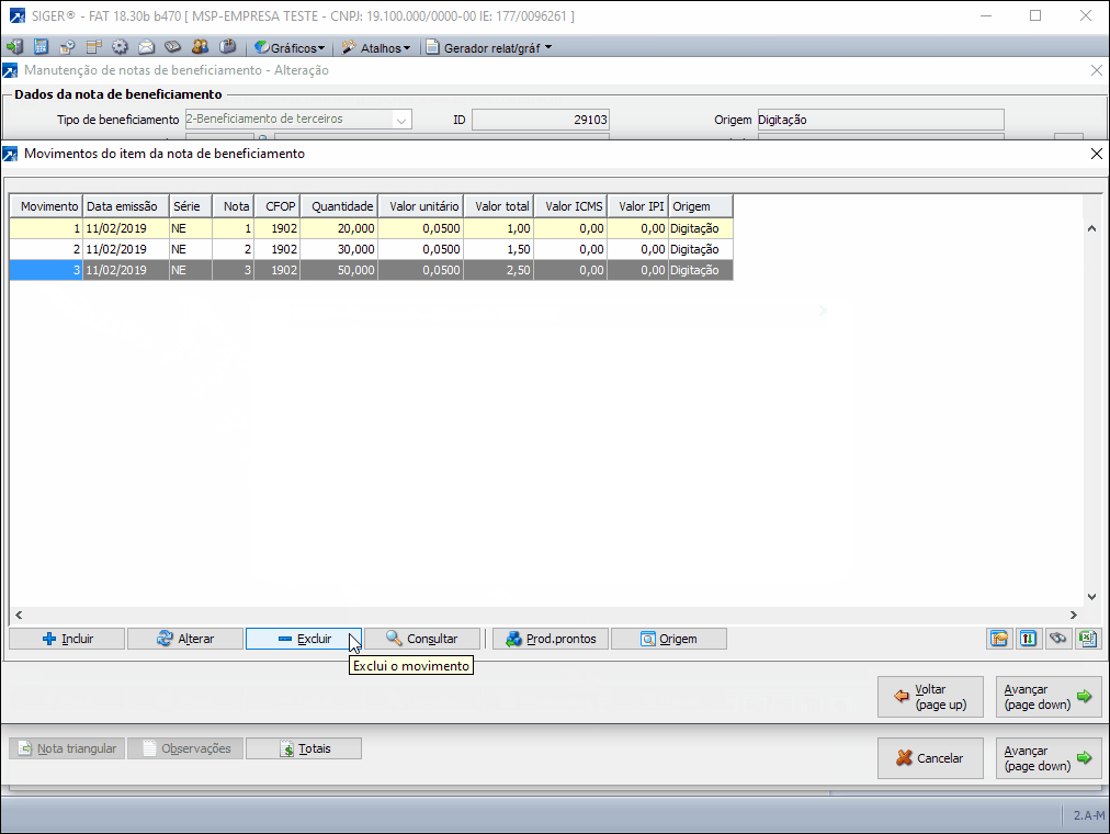 O exemplo aborda a exclusão de um movimento de retorno para um item da nota no controle de beneficiamento de terceiros. A exclusão do movimento deve ser feita através da alteração da nota no menu FAT 2.A-A ou pela manutenção consolidada no menu FAT 2.A-M (botão [Alterar]).