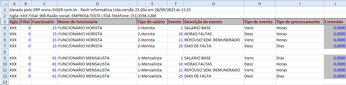 Ao gerar o arquivo .XLSX com os eventos selecionados, se faz necessário preencher somente a coluna "Conteúdo" com a referência de cada evento ou valor. Lembrando que não pode alterar o layout da planilha, ou seja, não pode excluir coluna ou incluir novas colunas.