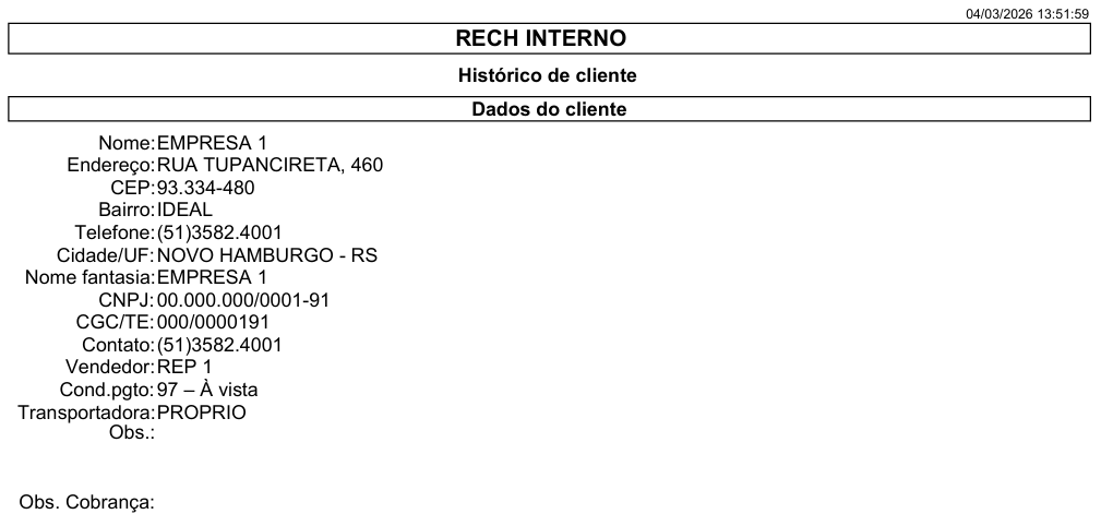 Após montar o filtro de clientes, o SIGER® irá exibir uma listagem semelhante a do exemplo abaixo, exibindo o histórico do cliente .