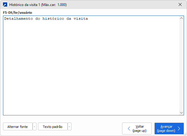 Texto de detalhamento por Tipo de histórico com até 1.000 caracteres.