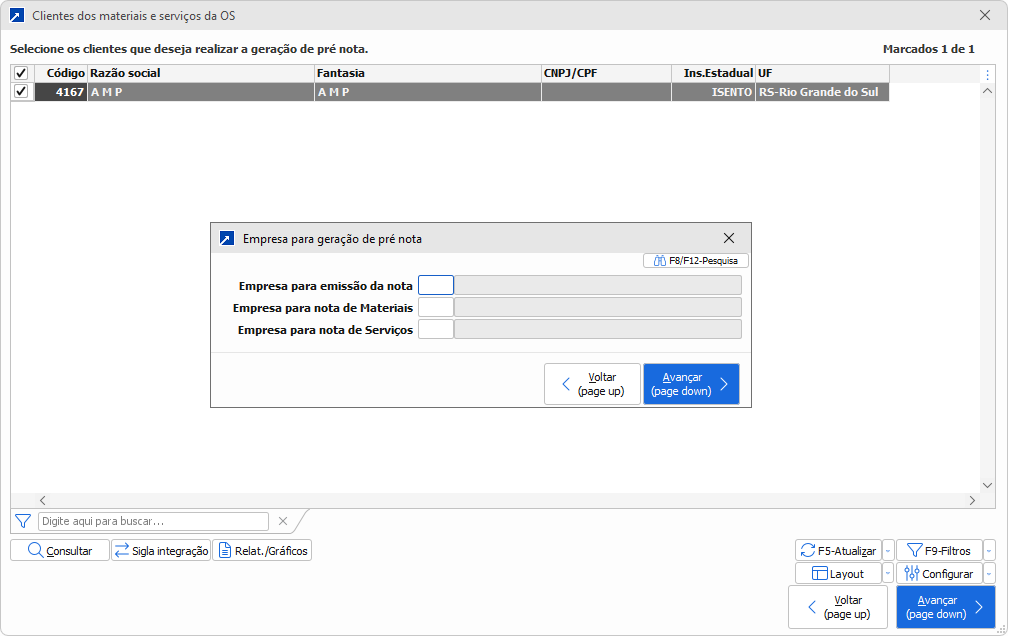 Caso esteja configurado no parâmetro de empresa o "Fechamento da OS em sigla diferente", será criado o botão [Sigla integração] para definir em qual sigla de empresa deverá ser gerada a pré-nota de faturamento.