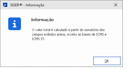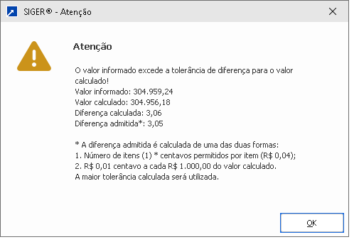 Nos casos em que a diferença excede a tolerância máxima permitida, o SIGER® não considera o valor informado para cálculo e a tributação deverá ser revisada.