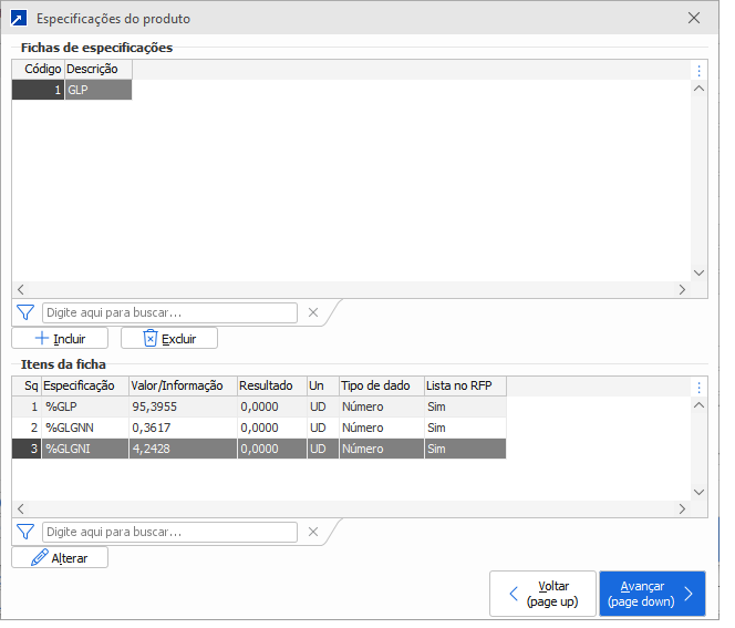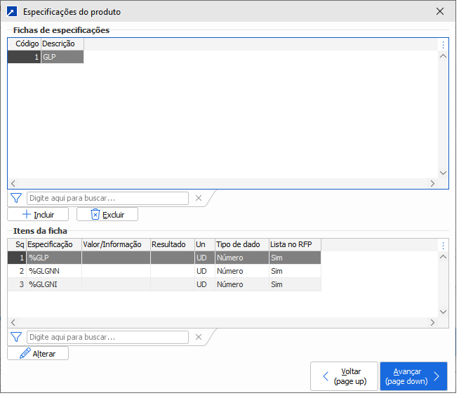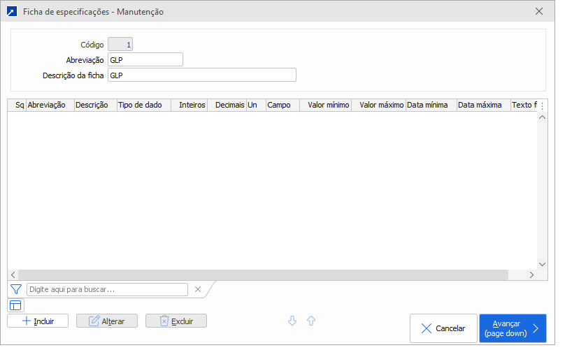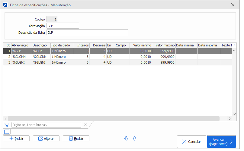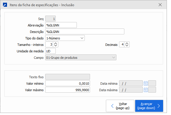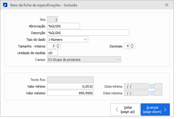 Depois de informar os campos exatamente como apresentados na imagem acima, avançar. Clicar no botão incluir e informar as outras duas especificações.