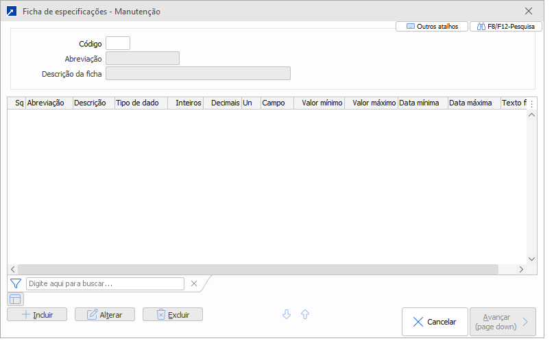 [Especificações]. Abrirá a tela para incluir a especificação, clicar no botão [incluir]. Informar o código da especificação cadastrada e dar enter. Serão listadas na tela as especificações.
