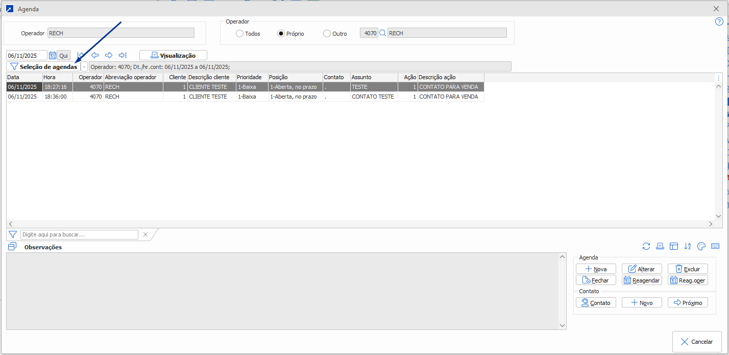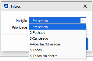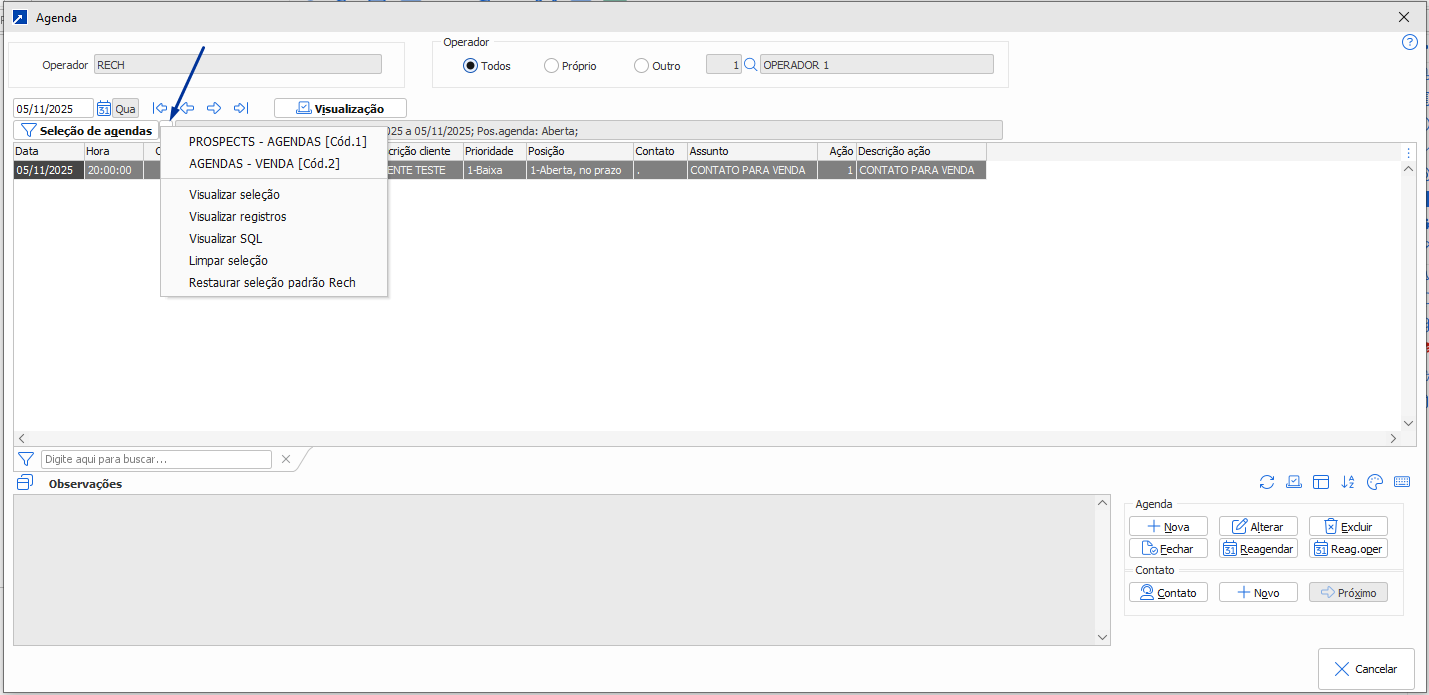 você não irá conseguir filtrar agendas que estejam fechadas. Ao mesmo tempo, se escolher 5-Todos poderá ter maiores opções de filtragem lá.Dependerá muito de que tipo de agendas devem ser exibidas.Um ponto importante a ser ressaltado é que você pode fazer seleções distintas e deixar elas salvas para que sejam utilizados dinamicamente pelo operador.Veja: