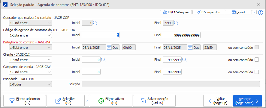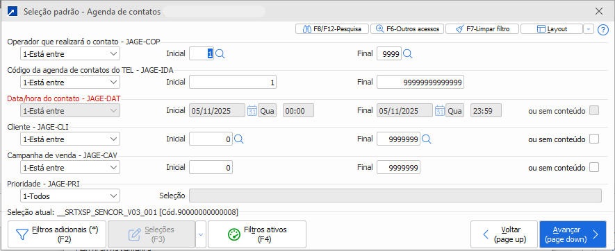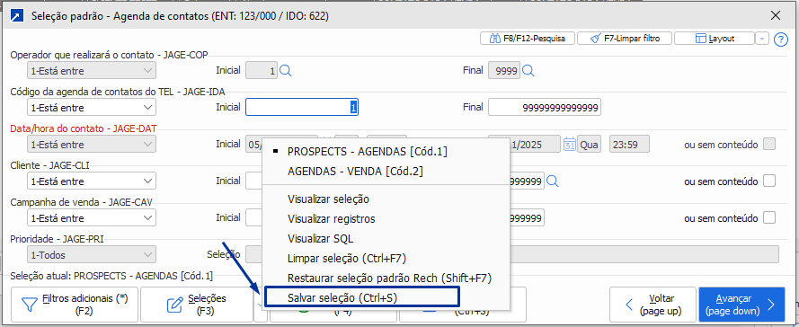 Por exemplo:a) Somente agendas de um determinado tipo de movimentob) Somente agendas de clientes do tipo prospect (usando filtros avançados do campo "Cliente")c) Somente agendas vinculadas a um determinado tipo de campanhad) Somente agendas de um determinado meio de contatof) Somente agendas de um determinado tipo de roteiroVale lembrar:O botão "Seleção de agendas" é condicionado no caso da agenda pelo botão <Visualização>Vide:
