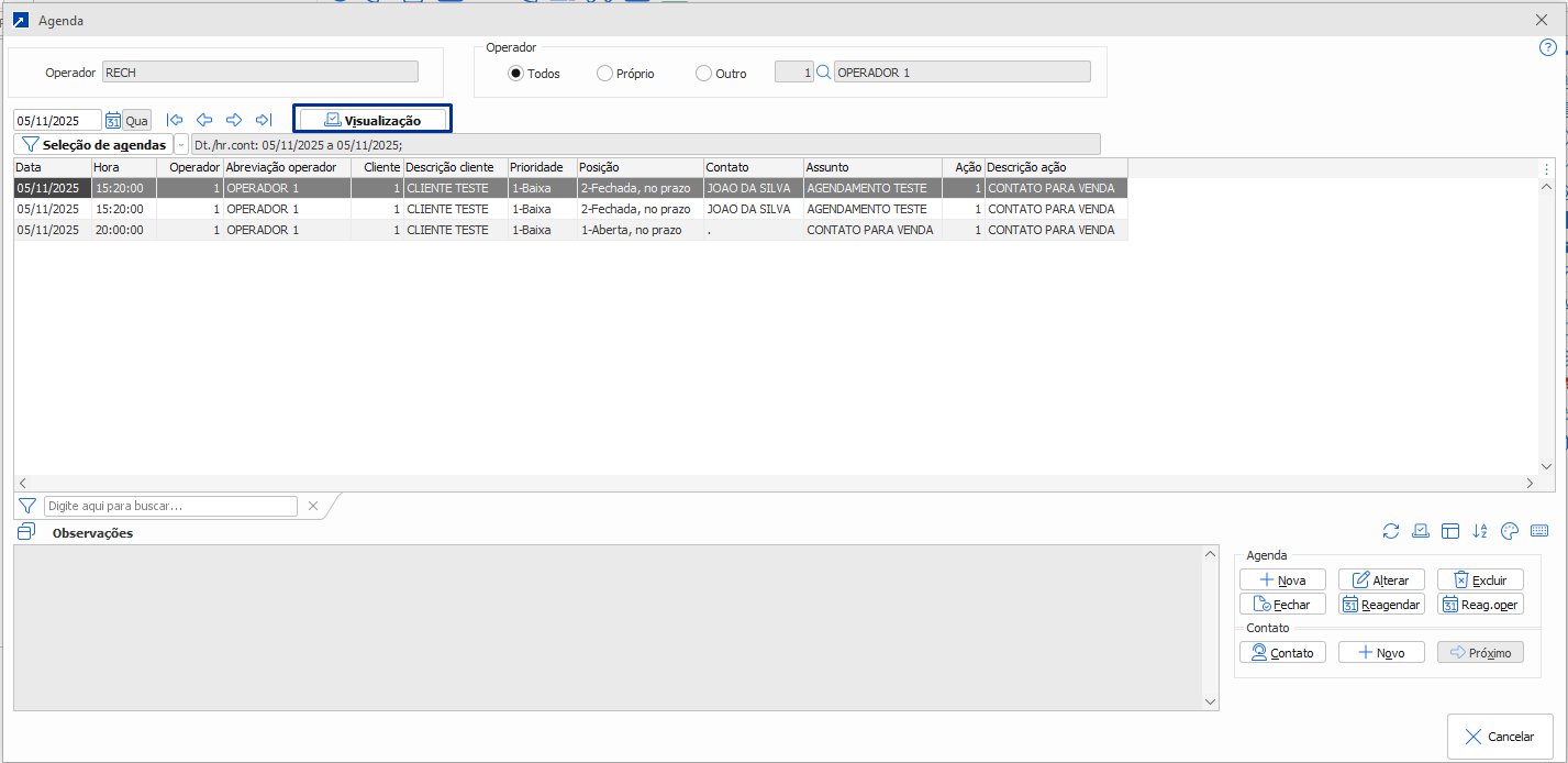 No botão <Visualização>, o usuário terá várias opções em relação a quais agendas exibir quanto a posição e prioridade na tela, sendo: