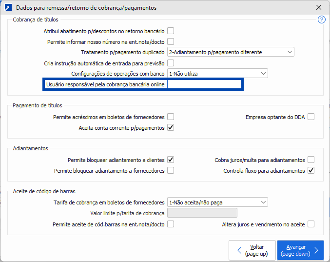 Tentativas para comunicação online: Caso ocorra erro de comunicação na remessa online, serão efetuadas novas tentativas para estabelecer conexão com o servidor bancário. Neste campo deve ser informado a quantidade de vezes que o SIGER® deve tentar restabelecer esta conexão.