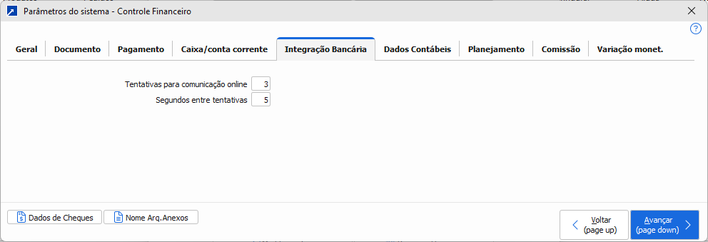Para evitar que o usuário precise efetuar alguma ação por falha de comunicação entre o SIGER® e o banco, foram disponibilizadas novas configurações nos parâmetros do sistema 1.1-P - Parâmetros do Financeiro - Integração Bancária.