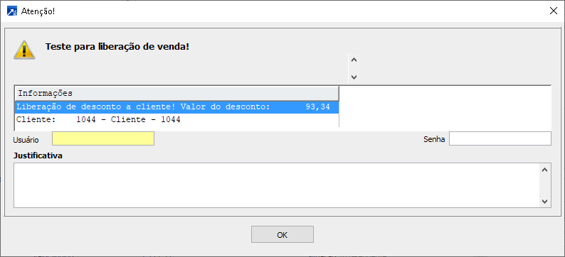 Neste exemplo ao informar o valor de desconto no campo "Desc./abatimentos" o SIGER® exibe a janela para informar o usuário e senha.