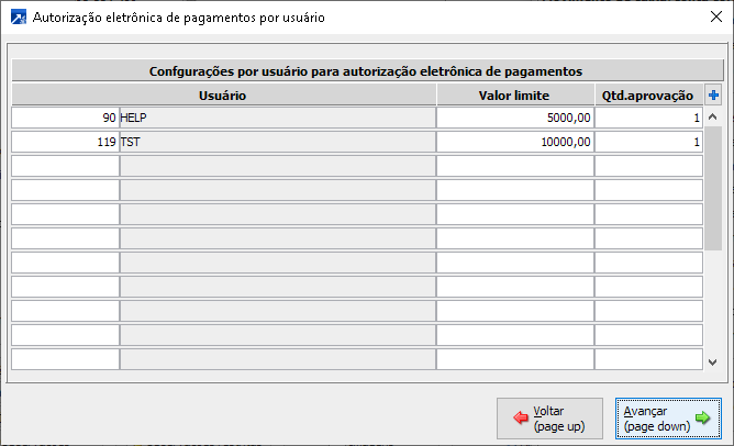 Este define a autorização de pagamentos por usuário possibilitando que mais de um usuário seja requerido para a autorização de um pagamento.
