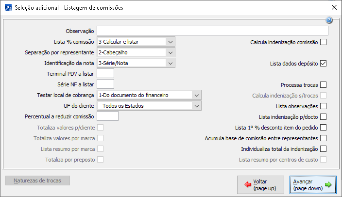 Seleção dos valores que serão listados no relatório: base de comissão, valor de venda, valor das mercadorias.